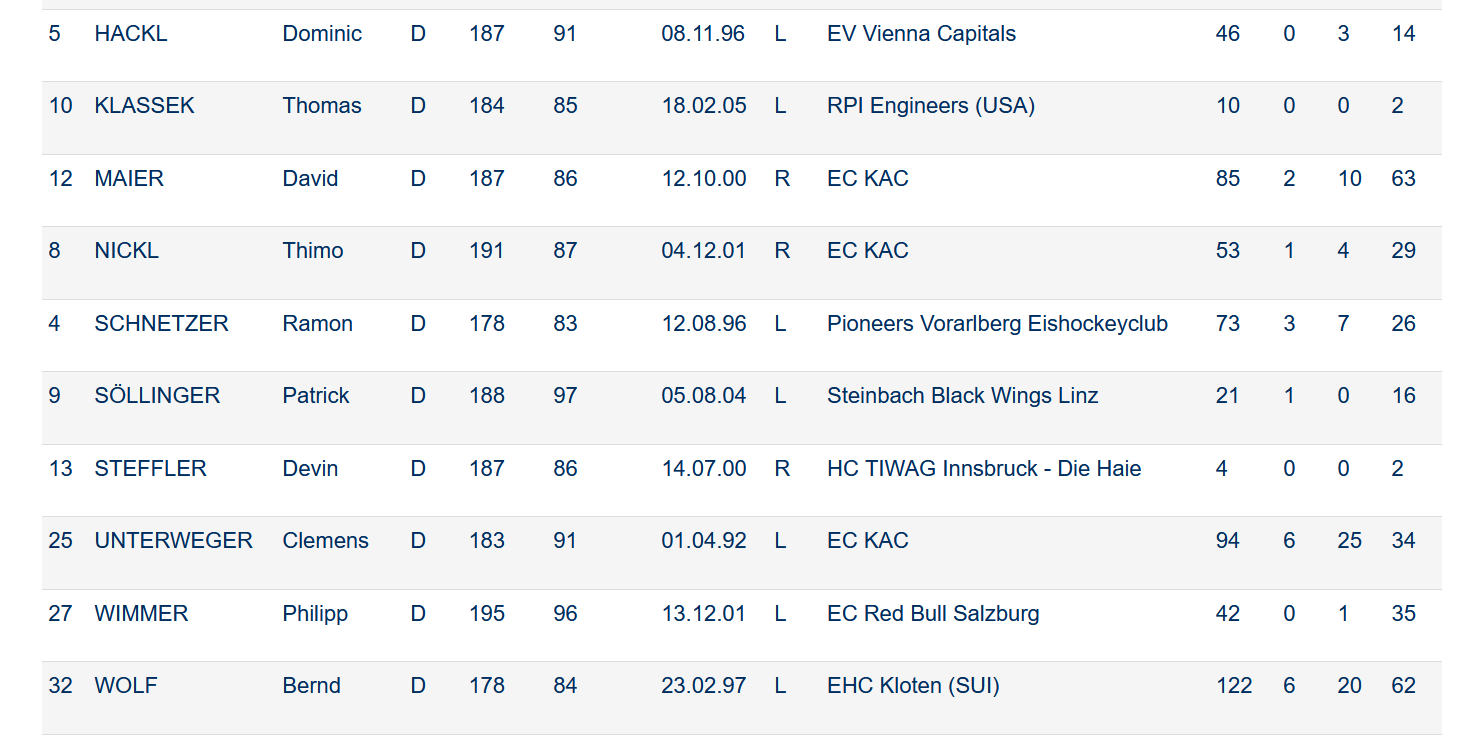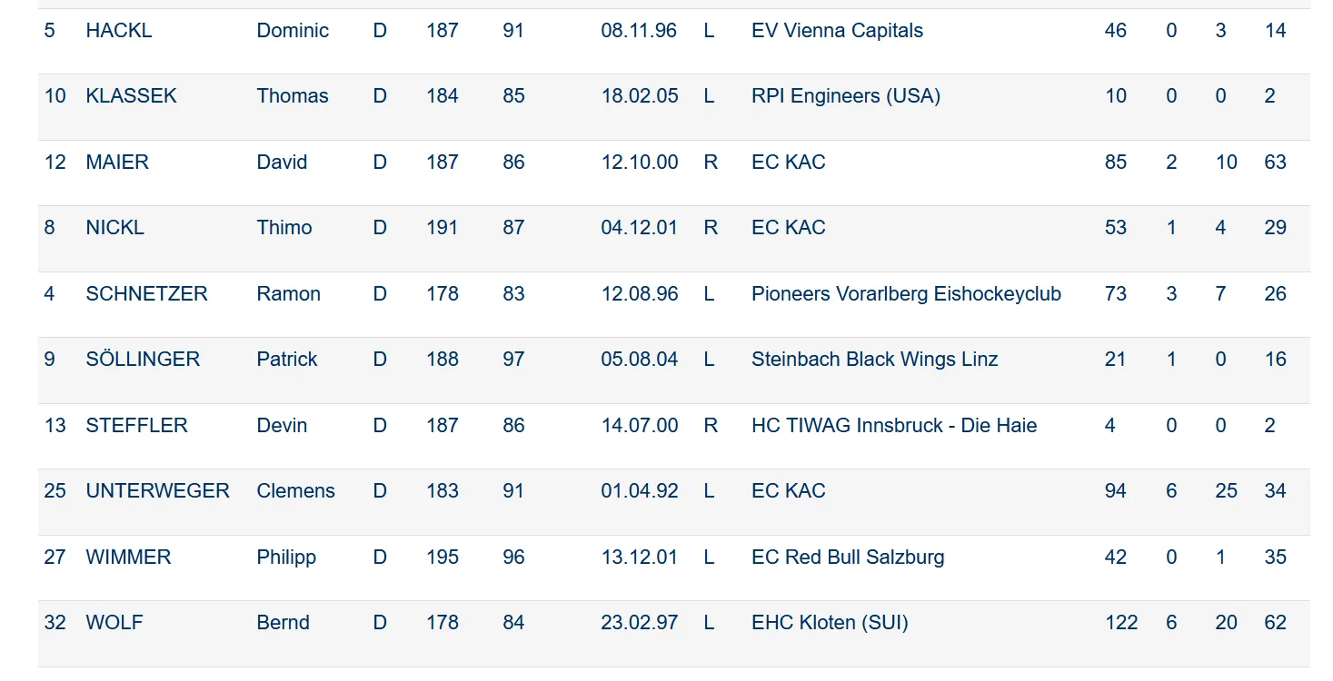 Stand jetzt fehlen also gegenüber vorigem Jahr fix Kasper, Rohrer, Haudum, Raffl, Achermann, Lebler, Heinrich, Lindner und Kraus. Kainz könnte noch einberufen werden...dafür Nissner und M.Huber heuer wieder dabei.