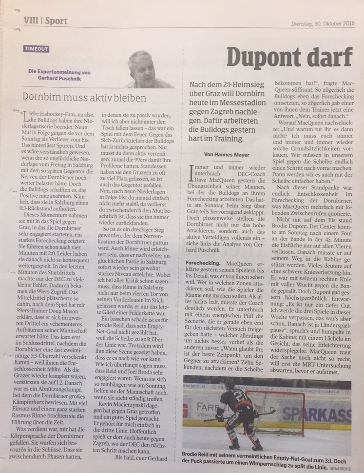 Hoffentlich kann heute die Mannschaft an ihre gute Leistung gegen Graz anschließen kann. Drei Punkte heute wären wichtig.