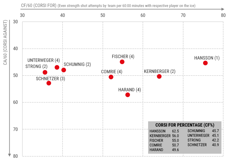 Aus der Analytics-Abteilung der #Rotjacken: Die Corsi-Werte (CF, CA, CF%) der KAC-Verteidiger nach vier Spieltagen (Anzahl der Spiele mit Eiszeit in Klammern). Die "Nachrücker" Kernberger und Hansson haben einen guten Job gemacht bisher.