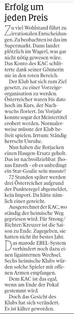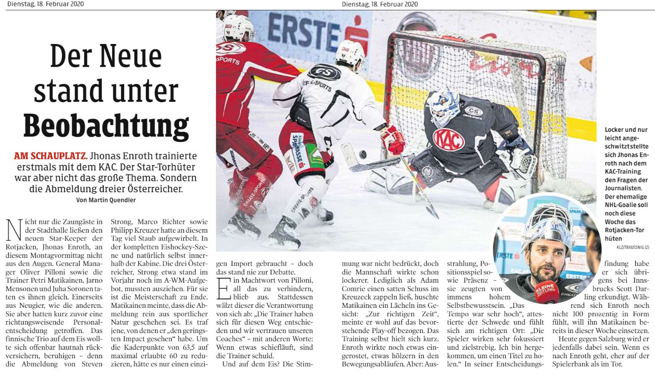 Unabhängig von Enroth und dessen Verpflichtung (und er ist nunmal der Ersatz für Haugen, mit dem sich Madlener halt sonst matchen müsste) finde ich es für einen "Austria-first" Verein wie den KAC weit bedenklicher, schwache Imports wie Liivik und Hansson im Kader zu behalten, um 3 Österreicher abzumelden. Es hätte gereicht, einen der Beiden abzumelden und man wäre aus dem Schneider gewesen.
