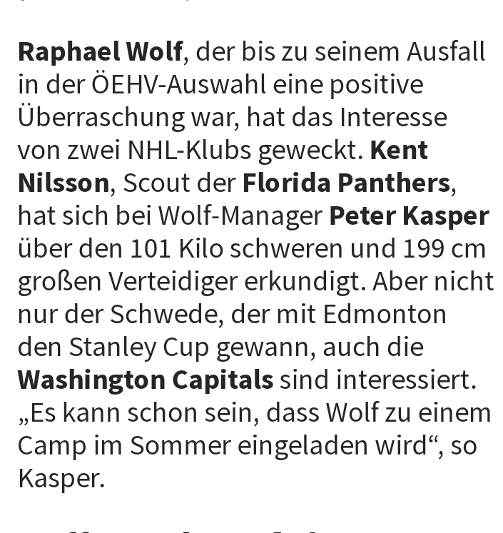 Aber die Schlagzeile, „23-jähriger Wolf, bei Dornbirn am Abstellgleis nun von NHL-Teams gejagt“ wirkt sich sicher nicht negativ auf den nächsten EBEL-Vertrag aus. Schlauer Fuchs der Kasper Peter.