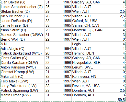 Mit deinen Punkten würd es sich ausgehen, da ja Schlacher, Spannring und Ulmer "nur" 2 Punkte zählen...dh mit De santis, Gartner und Romig hätten wir 59,5...also Vorstand BITTE EINKAUFEN!