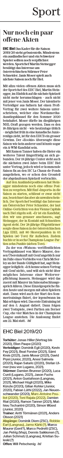 Gespräch mit dem EHCB. Ob Jarno Kärki bleibt oder nicht, keine Ahnung. Robbie Earl wechselt zu den SCL Tigers.