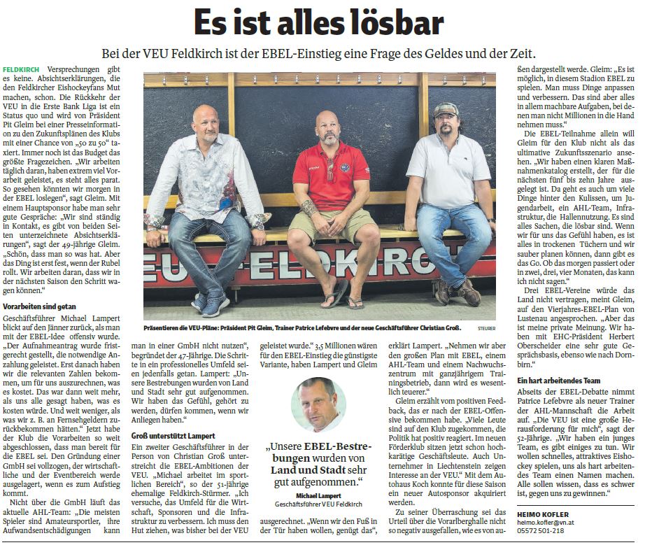 bei der VEU Feldkirch hat sich in den letzten Monaten einiges getan - und zwar nicht nur bei den Vorbereitungen für die kommende Saison, sondern vor allem auch im Hinblick auf unsere Zukunftspläne. Über einige dieser positiven Entwicklungen und Neuerungen möchten wir Euch gerne bei einem Sommer-Fanstammtisch am kommenden Dienstag 23. Juli ab 19:00 Uhr im Gasthof Löwen Tosters informieren.
