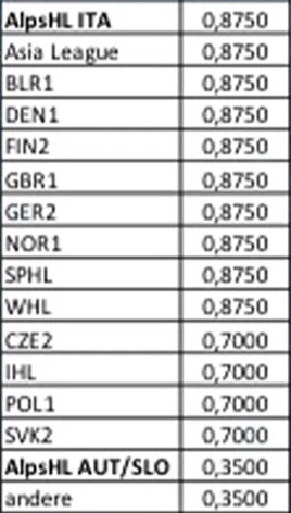 Und ich wiederhole mich - der Ligafaktor für Spieler aus Italien ist NATÜRLICH höher, als der für die Österreicher, weils für euch die erste Liga und für uns die zweite ist. Es geht ja um den nationalen Spieler und wo der vorher gespielt hat. Wenn ein Bozener aus der ICE bei Gröden aufläuft ist der nochmal mehr Punkte wert. Der Faktor da ist dann wohl 1, eure Alps Spieler 0,875 . Man kann darüber diskutieren, ob der Faktor nicht zu hoch ist und warum der, der Slowenen so niedrig wie unserer ist, aber dass der unsrige niedriger sein muss, das steht für mich fest und ist auch richtig so.