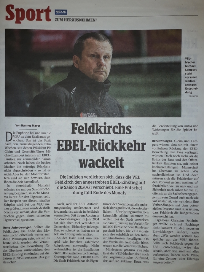 Hohe Anforderungen. Sollten die Feldkircher bis Ende des Monats nicht erheblich weiter mit ihren Planungen sein, als sie es heute sind, werden die Verantwortlichen die Bewerbung für das Oberhaus zurückziehen, den EBEL-Einstieg zumindest auf die Saison 2020/21 vertagen. Das gilt als sicher.