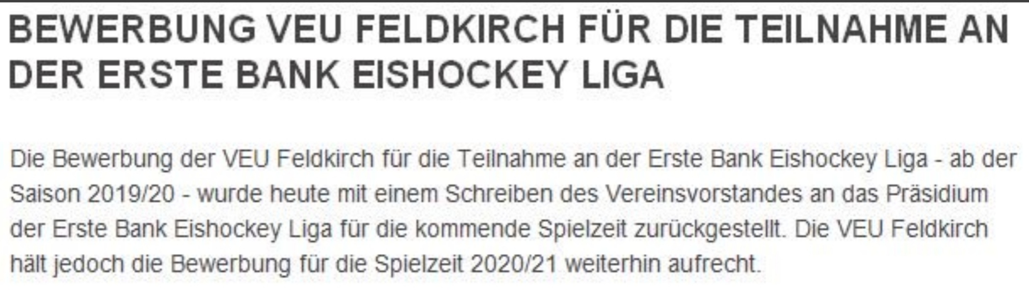 Nach gründlichen Überlegungen hat die Führung der VEU Feldkirch beschlossen, die Bewerbung um die Aufnahme in die Erste Bank Eishockey Liga vorläufig zurückzustellen. Wichtig ist folgende Klarstellung: An der Position der VEU Feldkirch, die erstmals bei der außerordentlichen Jahreshauptversammlung am 14. Jänner 2019 veröffentlicht wurde, ändert sich durch diese Entscheidung nichts. So wie bei JHV festgehalten wurde, besteht das Ziel in einer Teilnahme an der Erste Bank Eishockey Liga ab der Saison 2019/20 oder 2020/21 - wobei für 2019/20 eine vorläufige Nennung abgegeben wurde, um den vertieften Aufnahmeprozess in Gang zu setzen und um eine Basis zu schaffen, die Aufnahmebedingungen im Detail auszuloten. Bei der JHV wurde ebenfalls unmissverständlich betont, dass der Schritt in die Erste Bank Eishockey Liga 2019/20 nur dann vollzogen wird, wenn die finanziellen Voraussetzungen über einen Zeitraum von mehreren Saisonen gesichert sind und der Schritt bereits in diesem Jahr ohne finanzielles Risiko für den Verein möglich wäre. Im Hinblick auf die finanziellen Voraussetzungen sind in den letzten Wochen Fortschritte gemacht worden, allerdings reichen diese noch nicht so weit, dass jetzt schon von einer gesicherten Basis über mehrere Saisonen gesprochen werden kann. Parallel dazu wird auch die Zeit immer knapper, die für eine solide Vorbereitung einer Saison, insbesondere im Hinblick auf die Zusammensetzung des Kaders, notwendig wäre. Vor diesen Hintergründen wurde also entschieden, die Bewerbung vorläufig zurückzustellen, eine weitere Saison an der Alps Hockey League teilzunehmen, aber in enger Abstimmung mit der Liga und auf Basis der bisher schon erledigten Vorarbeiten an einer Teilnahme an der Erste Bank Eishockey Liga ab der Spielzeit 2020/21 zu arbeiten.