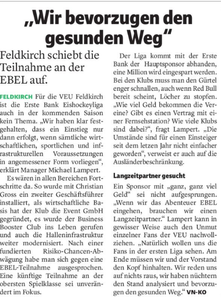 Da hat der Heimo Kofler - VN bzw. VEU Haus- und Hofschreiber - die Pressemitteilung abgeschrieben. Ein feiner Kerle, aber ein kritisches, hinterfragendes Wort ist von ihm nicht zu erwarten. Dafür sitzt er zu gerne im warmen Pressestüble in der Halle mit Ex-VEU Größen.
