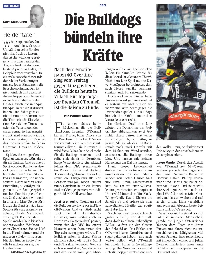 McQueen hat unter anderem dem O´Donnell zu viel Freiheiten gegeben was zur Unstimmigkeiten in der Mannschaft führten...er ist genau so wie beschrieben, für Tore machen ist er gut, den Rest......und genau diese Unstimmigkeiten merkt man iwi...sie treten nicht mehr als Team auf...kein Zusammenspiel, die Scheibe einfach rein ins Angriffsdrittel....zumindest war das gegen Znojmo so