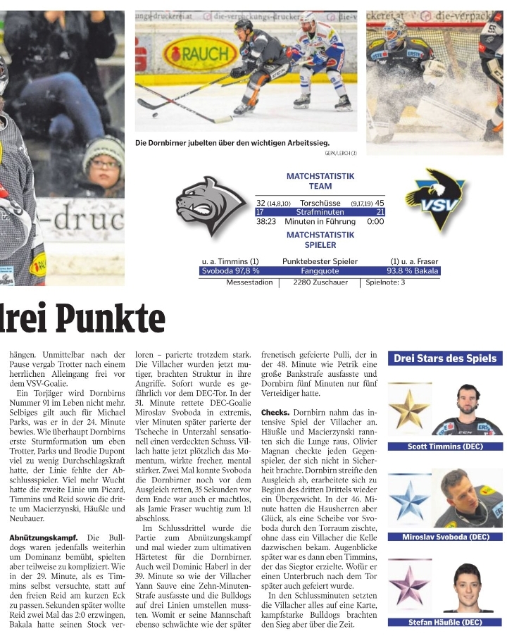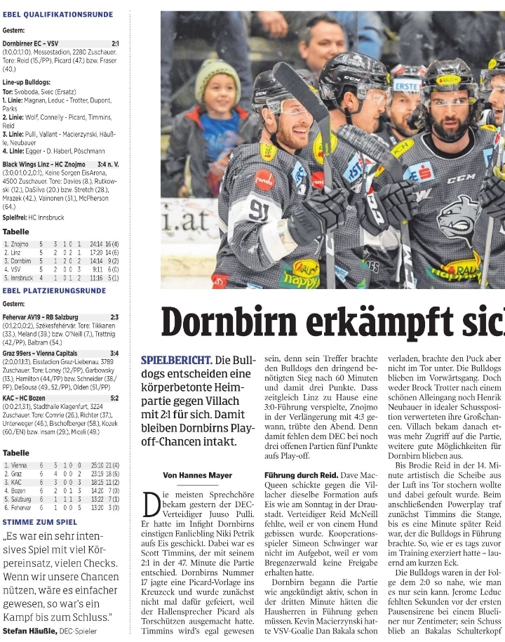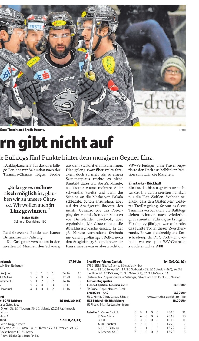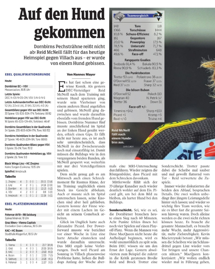 Die VN hat geschrieben, dass auch Goalie Svoboda angeschlagen ist und der Back-up Beck auch. Immer was los, bei den Bulldogs aus Dornbirn.