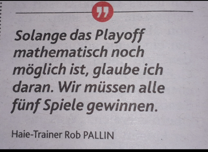 Mein Post war nicht als Zipferei gedacht. Sorry, wenn's so rüber gekommen ist. Ich hatte es eher als amüsant empfunden, dass das Statement des Haie Coaches auch von hier sein könnte - nur halt mit anderer Vereinsbrille.