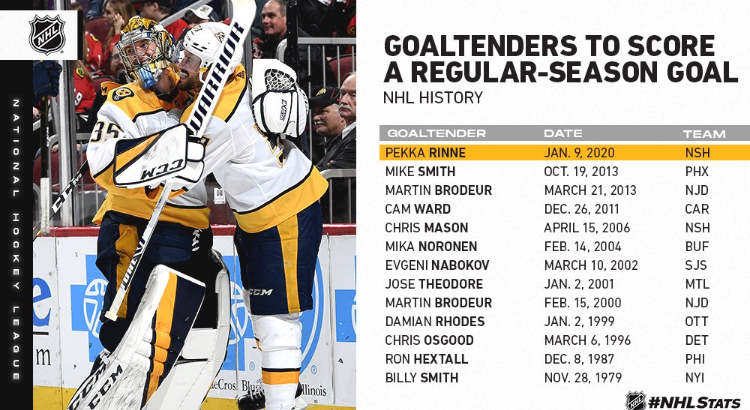 P. Rinne is the 12th goalie in NHL history to score a goal and the first since Mike Smith on Oct. 19, 2013. He shot into an empty net with 22 seconds remaining in the third period for the 5-2 final.