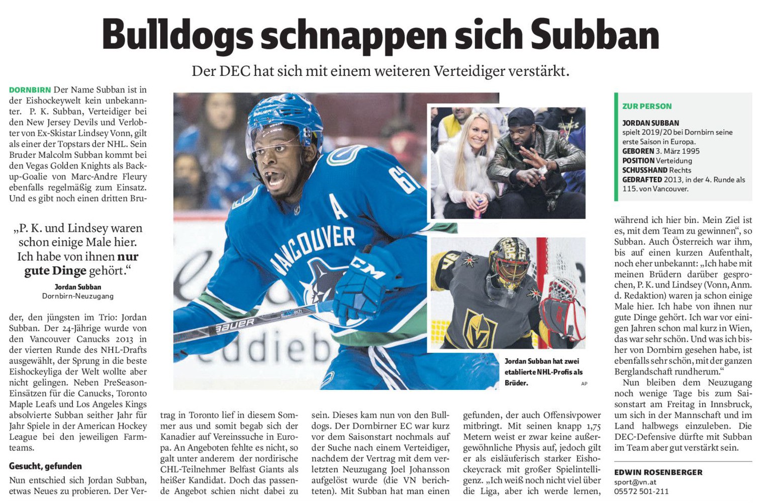 TRANSFER NEWS: Dornbirn Bulldogs signed defenseman Jordan Subban (CAN)