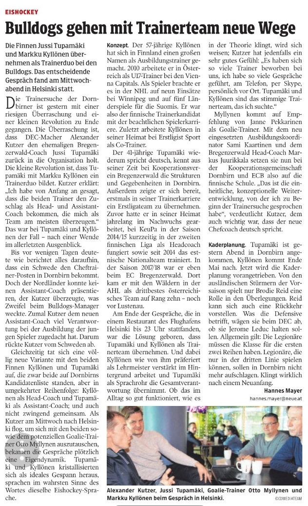In Helsinki traf sich Bulldogs Manager Alexander Kutzer mit seinen neuen Trainern, um letzte Vertragsdetails zu besprechen. Die drei Finnen Jussi Tupamäki, Markku Kyllönen und Otto Myllynen passen bestens zum Herzschlag der Bulldogs. "Die neue Struktur bringt eine durchgängige Linie in die Ausbildung vom Nachwuchs bis hin in die erste Mannschaft", beschreibt Kutzer den neu aufgestellten sportlichen Rahmen. Den in den letzten Jahren herangewachsenen Jungspunden wird dadurch eine gezieltere Ausbildung auf dem Weg zum Beruf Eishockeyspieler geboten.
