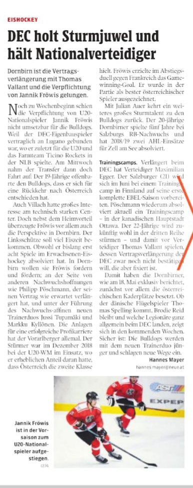 Noch keine Neuigkeiten gibt es von Dornbirns Kaderplanungen. Der dänische Flügelstürmer Thomas Spelling, der 2018/19 bei Aalborg auf 67 Scorer kam, steht nach wie vor hoch im Kurs bei den Dornbirnern. Nicht als Torschütze: Sie wissen beim DEC sehr wohl, dass die Scorerwerte in Dänemark nicht auf die