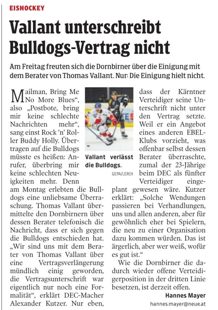 Schade mit Vallant aber ja, passiert halt ab und an im Eishockey Geschäft. Bleibt abzuwarten, ob seine Entscheidung richtig ist/war. Bis hierhin Danke für seinen Einsatz und nun Blick nach vorne.