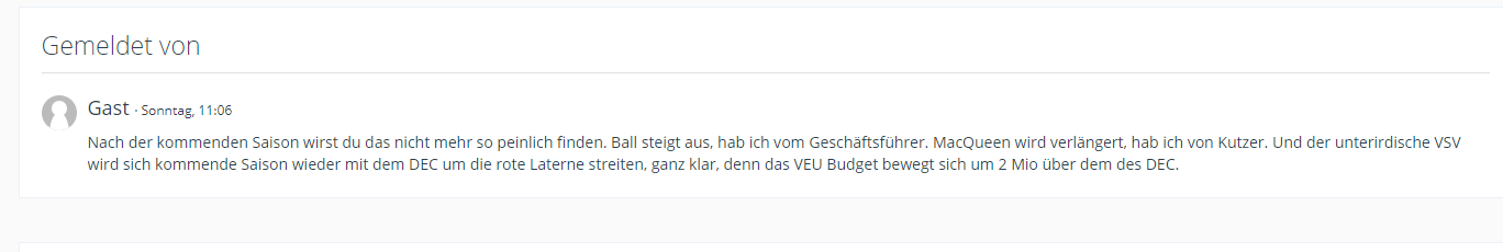 2. er sich punkto VEU wie ein frisch pubertierender 12jähriger (wobei das hier mehrere Feldkircher können) verhält. Jedes dritte Wort wird als versteckte sexuelle Anspielung erkannt oder in diesem Fall als Affront gegen die VEU. Dass für die meisten hier dieser Verein momentan keine besondere Rolle spielt, weil er einfach "nur" eine Alpsmannschaft wie Lustenau oder die Wälder ist und aktuell nicht in der EBEL spielt, ist scheinbar nicht zu akzeptieren. Es wird nur darauf gewartet, dass wieder ein achso böses Wort gegen den Verein seines Herzens geschrieben wird, egal an welchen Nasenhaaren diese perfide Anspielung auch herangezogen werden muss.