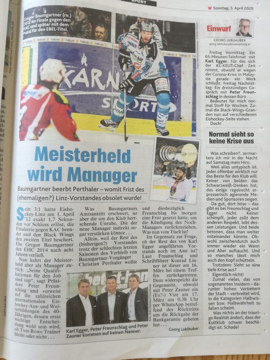 Das mit Baumgartner stimmt meiner Meinung nach ganz sicher. Die Krone schreibt ja selbst, dass der Leblhuber 3 Stunden bei Freunschlag im Büro gesessen ist.. da hat er diese Info ganz sicher erhalten. Davon mal abgesehen, dass schon seit Wochen intern gemunkelt wurde, dass Baumgartner der neue Manager wird (er war schon zuvor relativ viel in der Eishalle, was hätte er dort als TV Experte groß tun sollen?).
