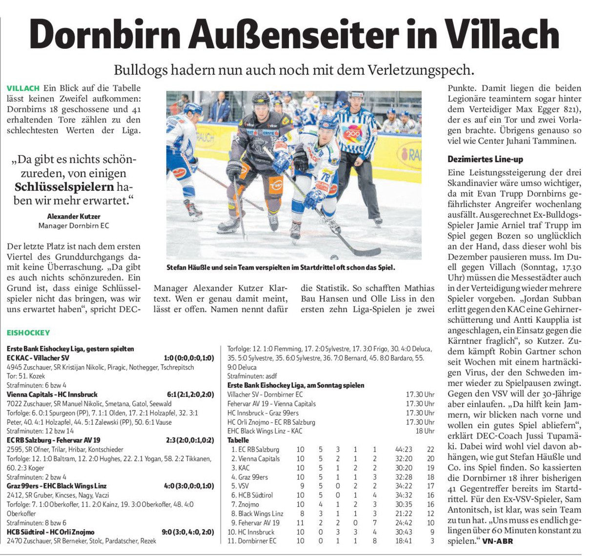 Würde mich interessieren, ob er daran denkt, vielleicht beim KAC um Schnetzer anzufragen (ähnlich wie Innsbruck bei Kromp), der als Vorarlberger Verteidiger beim KAC in den letzten beiden Jahren ständig andere Leute vor die Nase gesetzt bekommt und stagniert, unabhängig davon, wie er bei den wenigen Einsätzen in der EBEL spielt. Der bräuchte natürlich einen erfahreneren Partner neben sich, aber als 5. oder 6. Verteidiger kann der sowohl läuferisch, als auch spielerisch locker anderen Dauerbrennern einige Minuten abnehmen. Aber das wäre natürlich nur meine bescheidene Meinung, vielleicht hat ja der DEC oder der Spieler selbst gar kein Interesse daran. Ich erinnere mich einfach an das Jahr von Schnetzer unter Steve Walker, wo er fast die ganze Saison in den Top-6 des EBEL-Teams war und konstant starke Leistungen abgerufen hat. Und wenn man bedenkt, wie es um den Verteidiger-Nachwuchs in Österreich aussieht, finde ich es extrem schade, einen potenziellen EBELer in der AHL verkommen zu lassen, weil man lieber einen jungen Schweden "fördert".