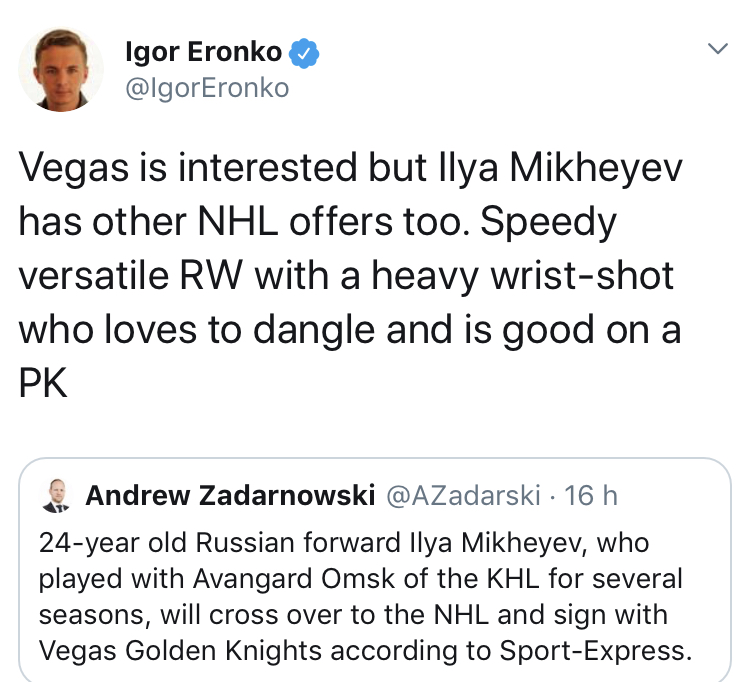 Ich glaube auch fast nicht, aber Russen sind immer mit einem kleinen Risiko verbunden. Wird sicher noch 2 Jahre in der KHL bleiben. Dort spielt er bei SKA, und die könnten ihm wohl auch ordentlich Geld geben. Wer weiß, ob er unbedingt in die NHL will. Da wird man erst beim Combine viel erfahren. Die U18 WM von ihm auch überschaubar. Aber ist auch in einem schwächeren Team.