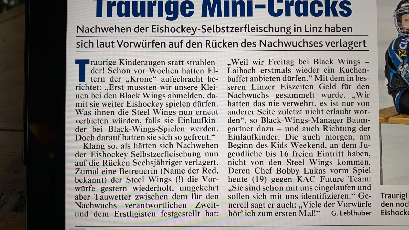 Naja der Lebelhuber könnte das gar nicht schreiben wenn nicht so wichtige Eltern sofort zur Krone laufen würden!!!!! Die Eltern haben leider vergessen, dass es für die Linzer Kinder ohne die Steel Wings und Lukas und co kein Eishockey mehr geben würde! Einige Zeit hat es kein Eis mehr gegeben für die Kinder. Einfach absolut unnötig jetzt hatte man in Ruhe arbeiten können! Aber anscheinend gibt es Personen die keine Ruhe haben wollen!