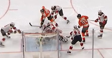 und nach 16 sekunden schlägt es das erste mal hinter Schneider ein, Severson einen meter hinter dem alleine vor Schneider stehenden Huberdeau. :banghead: