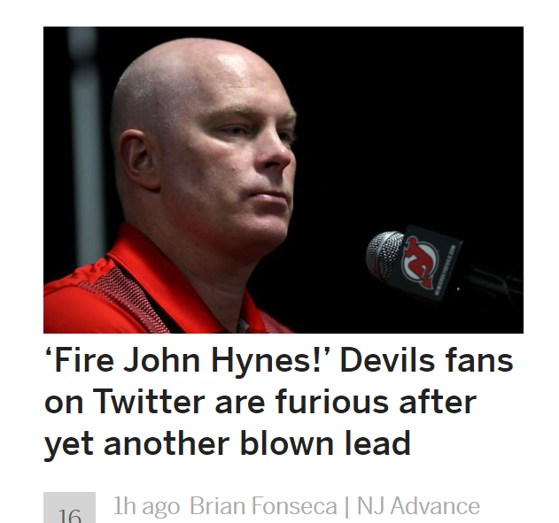 Man hat vorne mit Hughes, Hischier, Hall und Gusev unglaubliches Talent. Aber ich kenne das ja von meinen Ducks letzte Saison. Unter Carlyle eine Katastrophe, danach hat Murray (als GM) übernommen und es lief viel besser. Shero muss einfach die Reisleine ziehen. Wenn sogar am Kids Day die Buhrufe deutlich zu hören sind in den letzten 10 Sekunden.