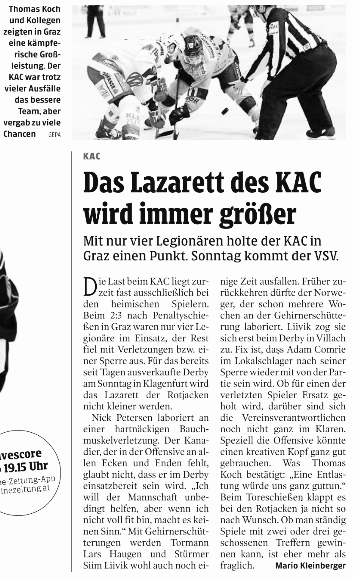 Liivik und Haugen mit Gehirnerschütterung noch länger out. Petersen glaubt laut Kleine Zeitung nicht an ein Comeback am Sonntag (hartnäckige Bauchmuskelverletzung).