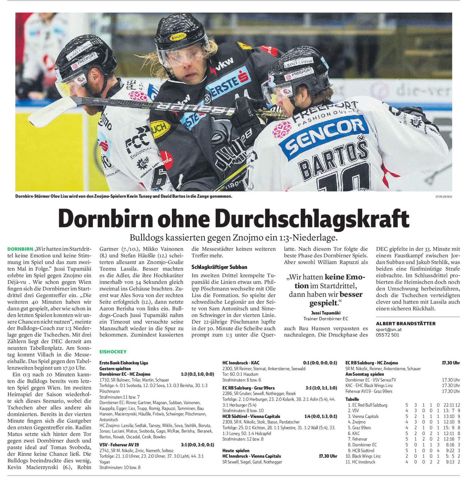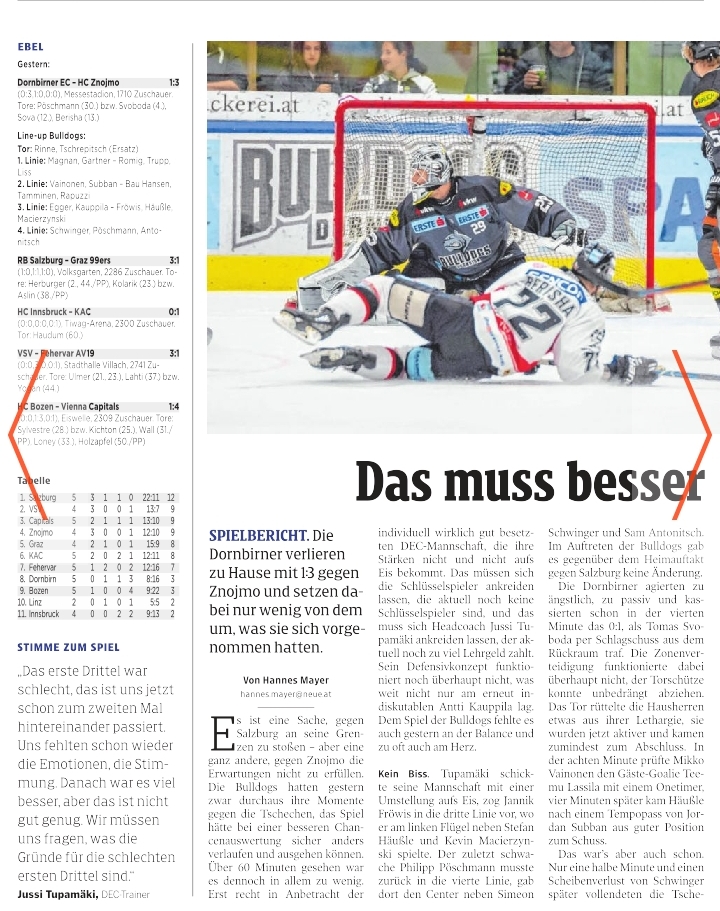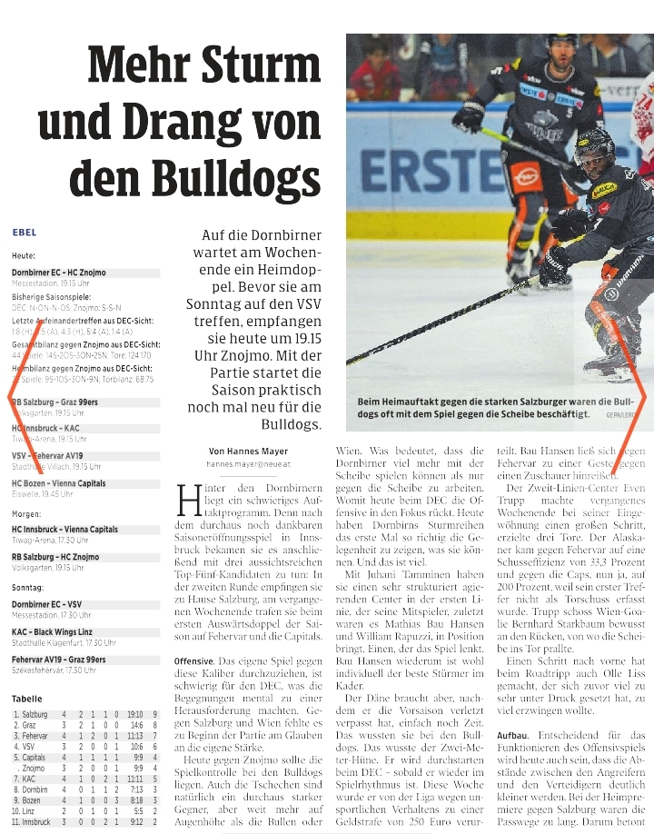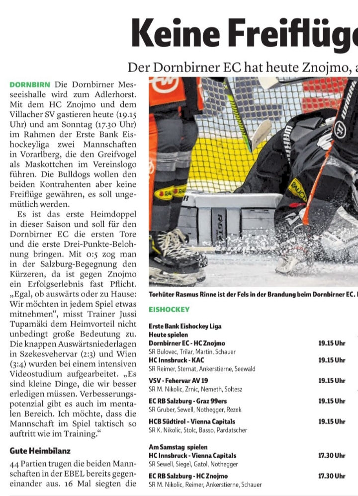 So, Auftakt ins Heimdoppel an diesem Wochenende, welches ja bekanntlich verschieden farbiges Großgeflügel beinhaltet. Am Freitag als erstes zu Gast die roten Adler aus Tschechien, welche uns manchmal liegen und manchmal auch nicht. Bin optimistisch, dass wir nach den Leistungen beim Auswartsdoppel nun bereit sind, dass der erste 3er der Saison erreicht und die Mannschaft belohnt wird für ihre Entwicklung.