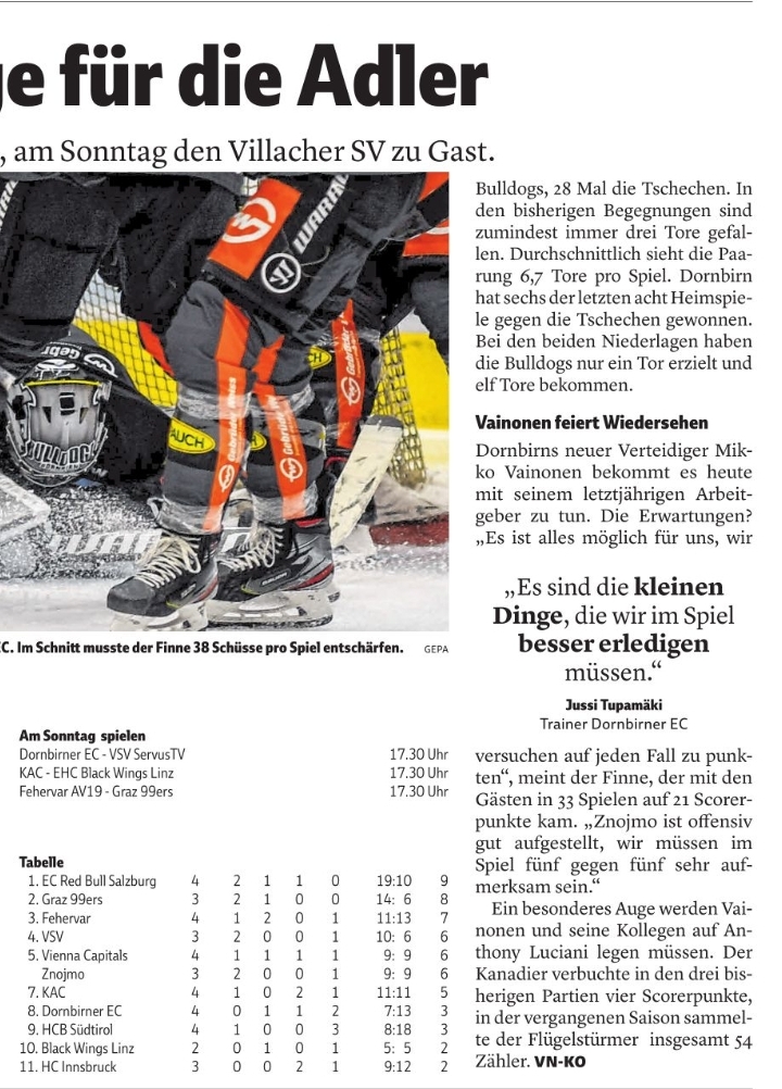So, Auftakt ins Heimdoppel an diesem Wochenende, welches ja bekanntlich verschieden farbiges Großgeflügel beinhaltet. Am Freitag als erstes zu Gast die roten Adler aus Tschechien, welche uns manchmal liegen und manchmal auch nicht. Bin optimistisch, dass wir nach den Leistungen beim Auswartsdoppel nun bereit sind, dass der erste 3er der Saison erreicht und die Mannschaft belohnt wird für ihre Entwicklung.