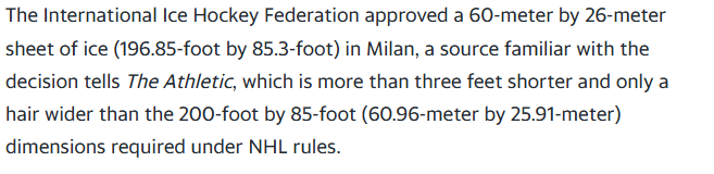 The International Ice Hockey Federation approved a 60-meter by 26-meter sheet of ice (196.85-foot by 85.3-foot) in Milan, a source familiar with the decision tells The Athletic, which is more than three feet shorter and only a hair wider than the 200-foot by 85-foot (60.96-meter by 25.91-meter) dimensions required under NHL rules.