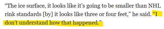 Wie kann man so unfähig sein und scheinbar eine Eisfläche aufbauen, die KLEINER ist als NHL Eis? Ich mein, das ist ja keine Raketenwissenschaft, die Bande hams ja auch bestellt die wird ein fixes Maß haben, wie ist denn das abgelaufen?