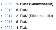 Bei Olympia das letzte Mal 2006 Gold, danach noch einmal Silber 2014.