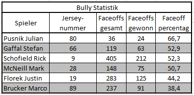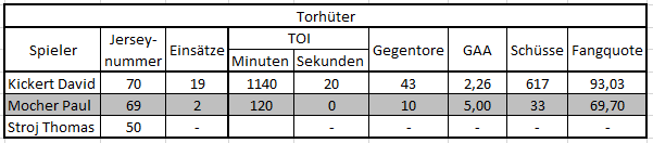 Mit den Strafen könnts noch etwas besser werden im Laufe der Saison, da sind bis auf Brucker und Gaffal nach 17 Spielen schon alle einmal auf der Bank gesessen. Am Besten kennt Wolf die andere Perspektive aufs Eis mit 24 Strafminuten und auch Valach hat mich ein wenig "geschreckt", der steht nach 7 Partien bereits bei 10 Strafminuten.