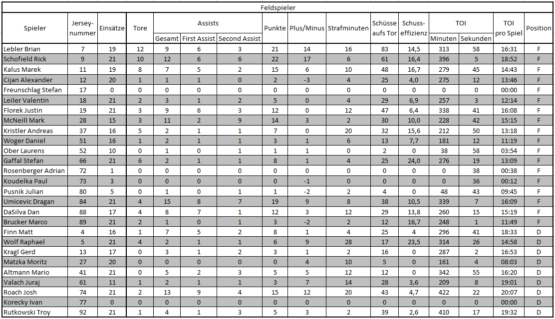 Mit den Strafen könnts noch etwas besser werden im Laufe der Saison, da sind bis auf Brucker und Gaffal nach 17 Spielen schon alle einmal auf der Bank gesessen. Am Besten kennt Wolf die andere Perspektive aufs Eis mit 24 Strafminuten und auch Valach hat mich ein wenig "geschreckt", der steht nach 7 Partien bereits bei 10 Strafminuten.
