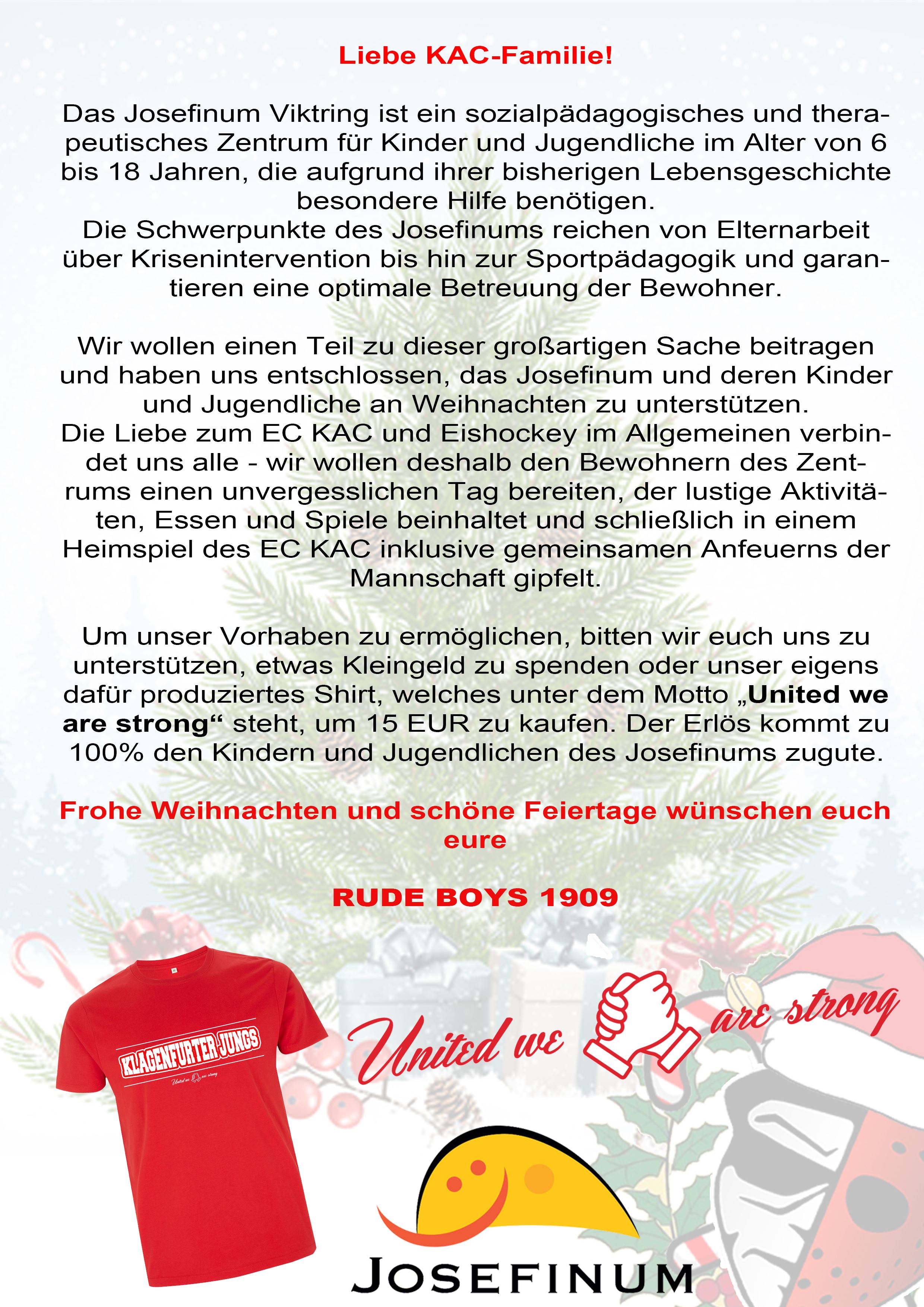 Es werden Leute mit Spendenboxen in der Halle unterwegs sein und Spenden sammeln. Auf der Oststiege wird es ebenfalls die Möglichkeit zu spenden geben. Des Weiteren gibt es die Möglichkeit T-Shirts zu erwerben. Die T-Shirts für Frauen (Klagenfurter Mädels-united we are strong) gibt es bereits ab heute, die T-Shirts für Männer (Klagenfurter Jungs-united we are strong) beim nächsten Heimspiel gegen Salzburg (6.12.), Bestellungen hierfür nehmen wir aber gerne bereits heute auf. Der Erlös kommt 100% dem Josefinum und den Kindern zugute.