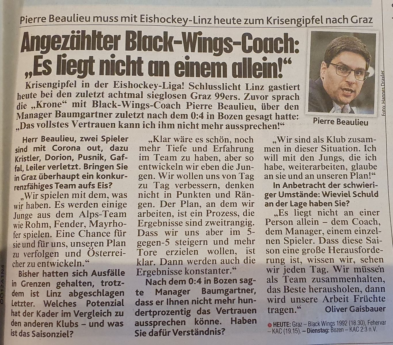 "Lamberti-Charles wird nach der Vereins-Abspaltung der Jugend aus der Kasse der Steel Wings bezahlt. Manager Konrad Linner wurde über die Pläne Baumgartners noch nicht in Kenntnis gesetzt, wie aus einer OÖN-Anfrage hervor ging."