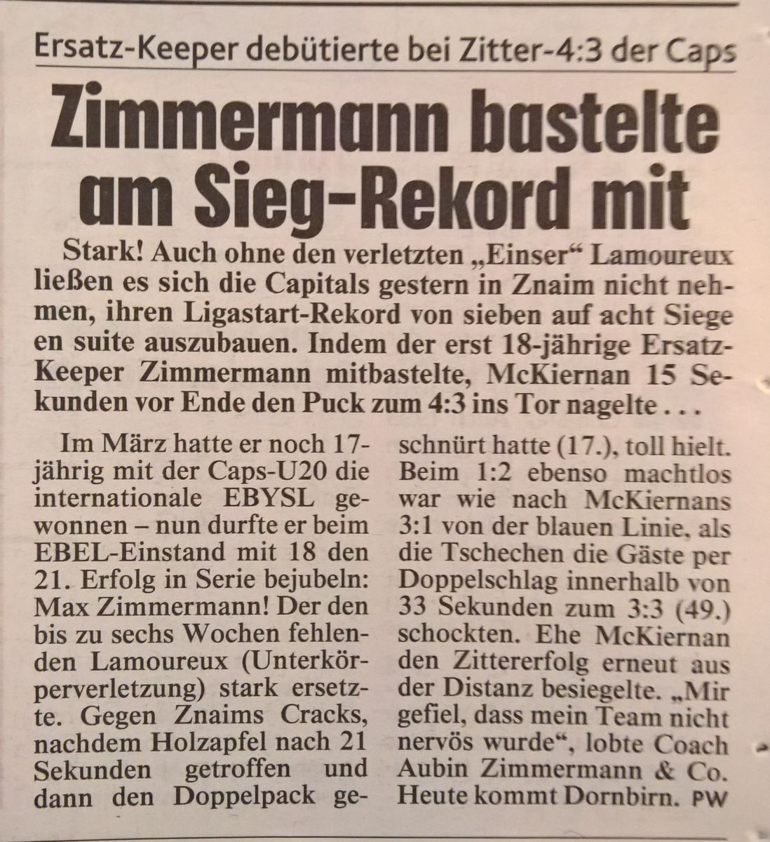 Um Zimmermann wärs echt schade. Der Bursche hat ja 2017 schon 2 grandiose EBEL-Spiele gezeigt. Ein Sieg in Znojmo und ein Heimspiel-Shutout gegen Dornbirn.