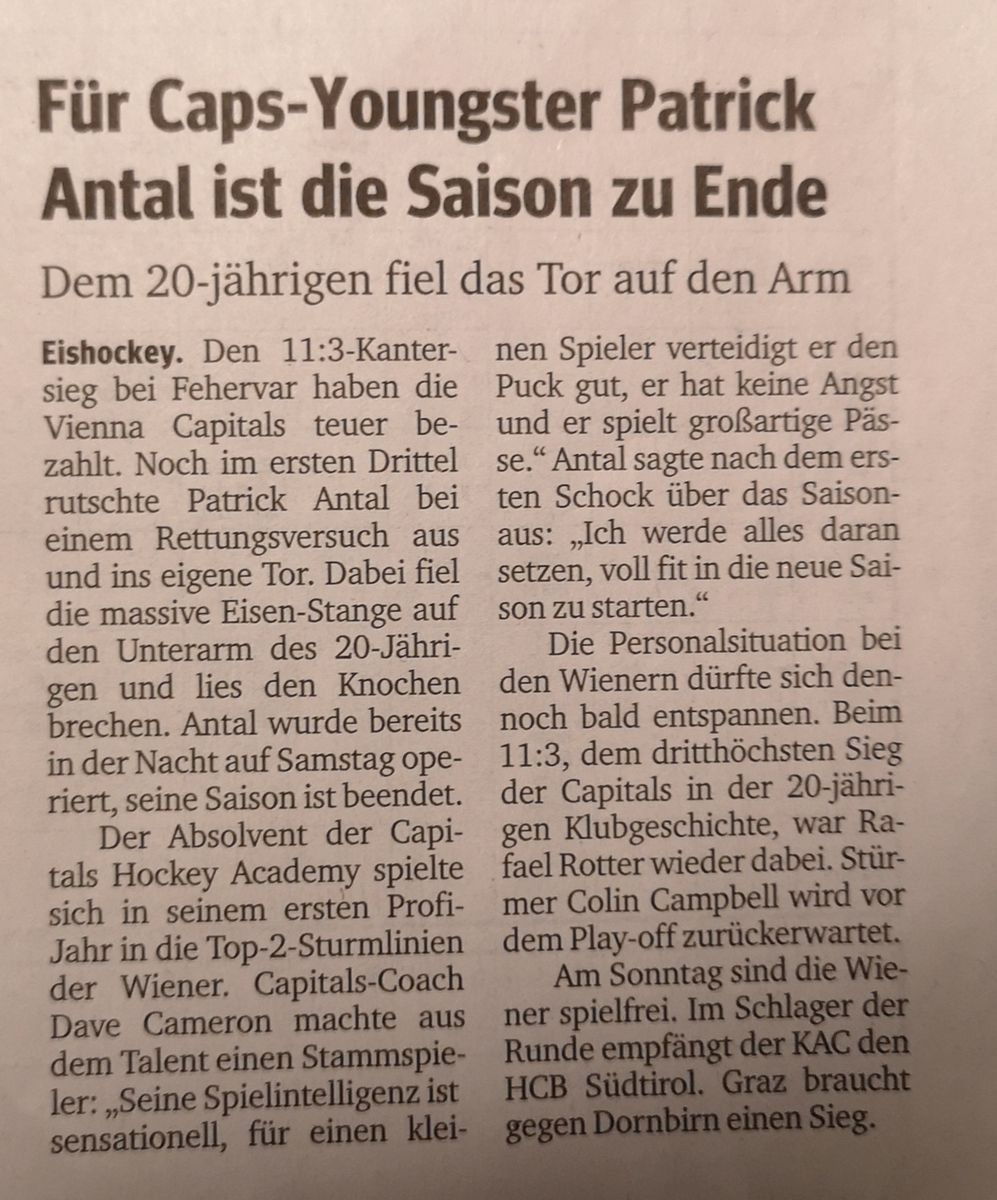Gute Besserung an Patrick Antal! Ewig schade, der Bursche hätte es sich mMn echt verdient gleich mal Playoff Hockey zu erleben, hat er doch echt gute Leistungen gezeigt. Gegen den KAC hab ich ihn als sehr auffällig in Erinnerung. Bin mir aber sicher, dass er stärker zurückkommt, Ihr habt da echt einen sehr vielversprechenden einheimischen Stürmer für die Zukunft ![]()