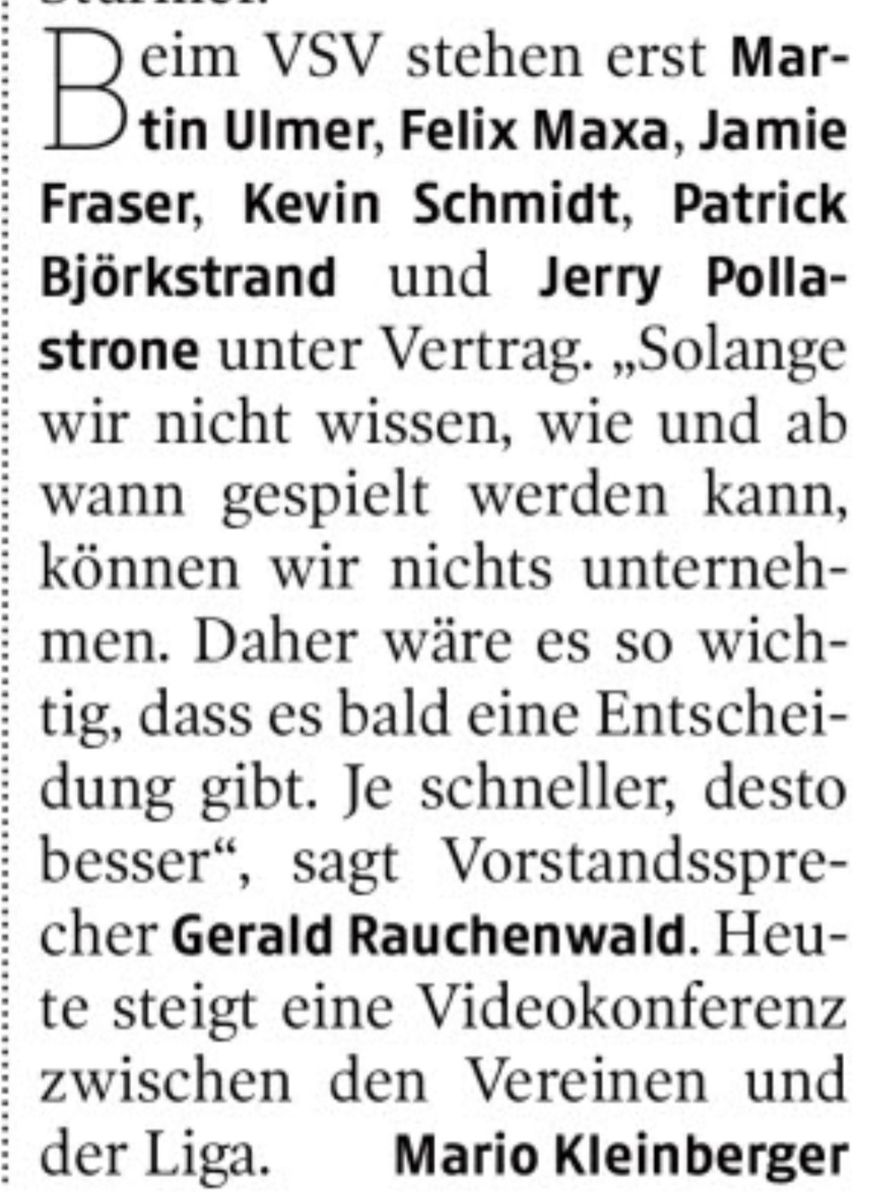 Laut KLZ vom 12. Mai findet heute eine Telko der Liga statt. So wie Rauchenwald hoffe ich auch, dass endlich die Planungen für die kommende Saison starten können.