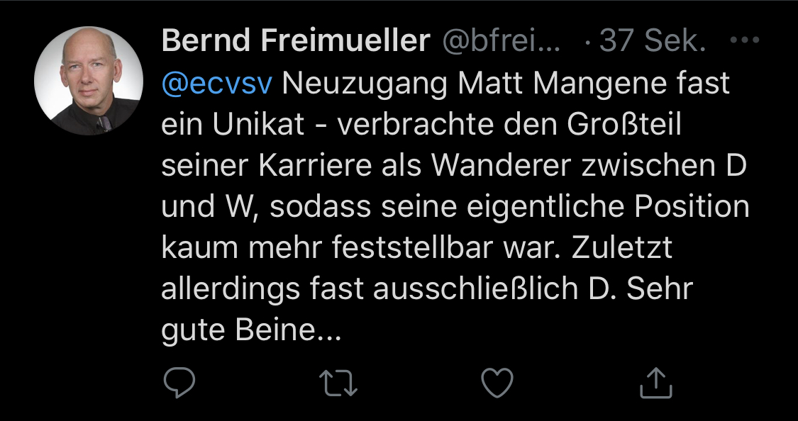Ich hoffe du bist in deiner Erwartungshaltung mit dem Signing von Matt Mangene nicht enttäuscht.^^:prost: