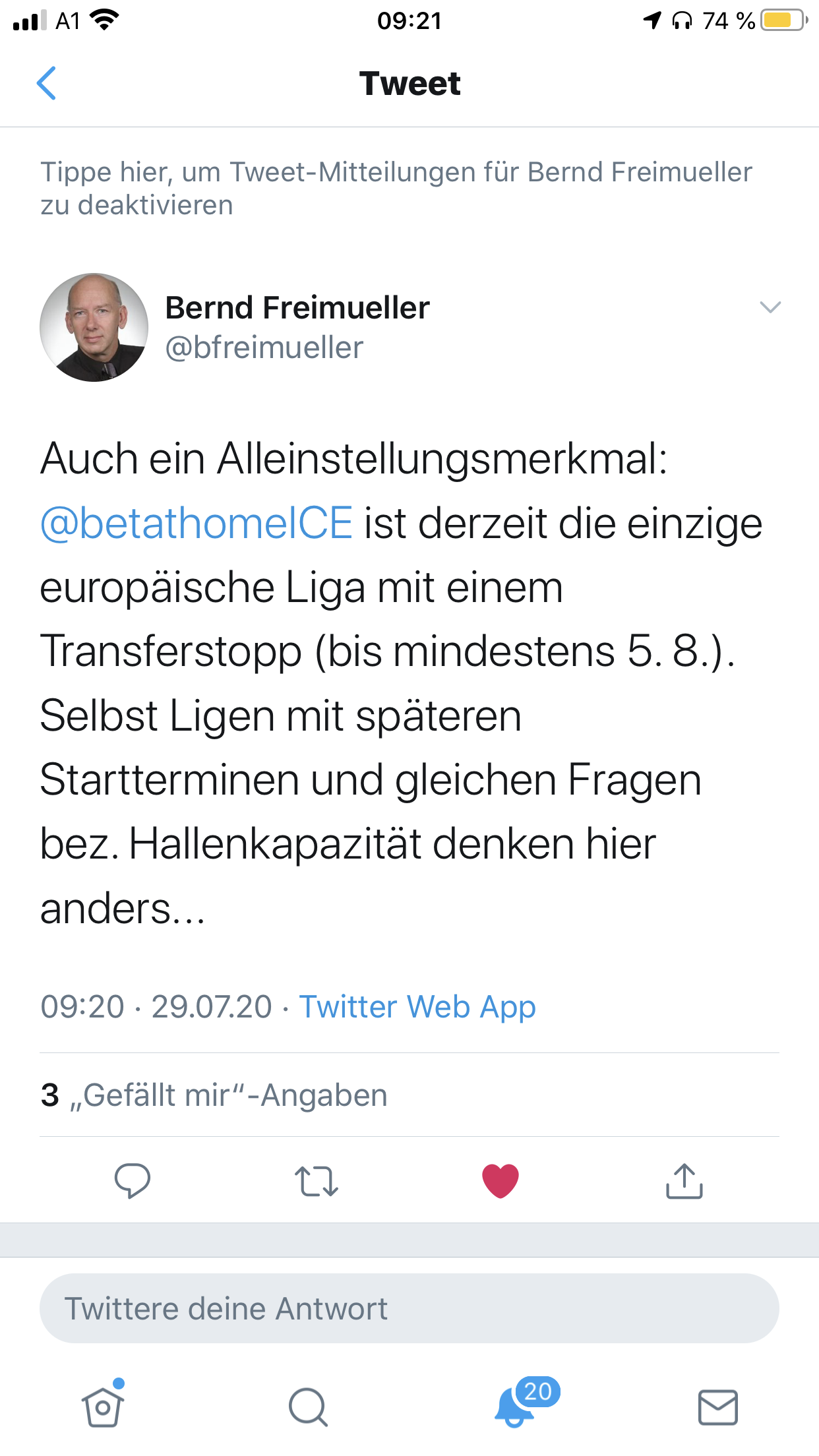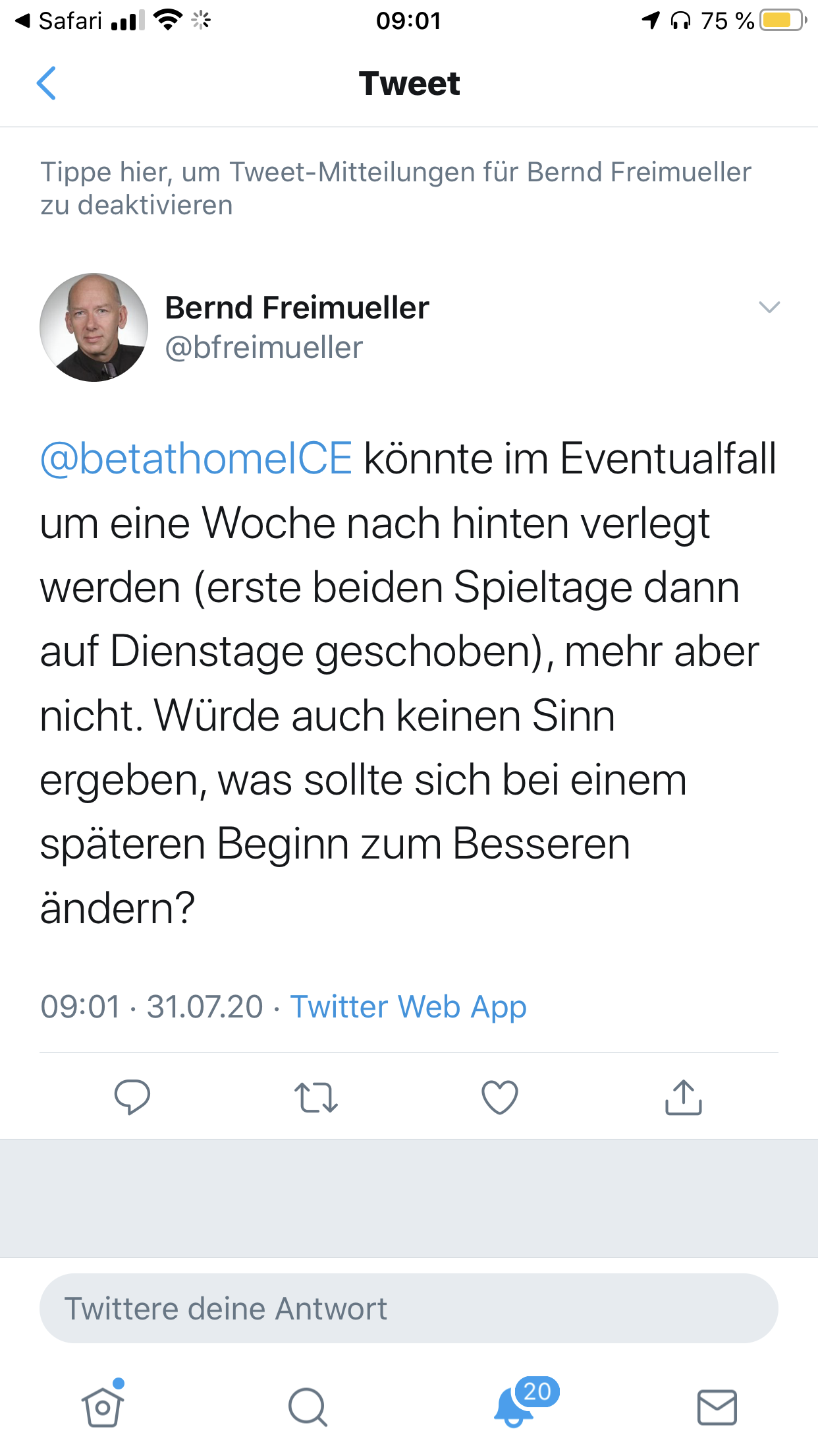 Außerdem war die Eishockey-Liga schon längst abgebrochen ohne Aussicht auf Wiederaufnahme. Die Fußball-Liga hatte aber, da es eben eine Outdoor-Sportart, die bei fast jedem Wetter gespielt werden kann, die Aussicht, dass sie unter Auflagen im Frühsommer wieder aufgenommen werden kann. Logischerweise wird man das vorher besprechen und dann auch im Hinblick auf eine neue Saison, welche ja auch normalerweise vor der Eishockeysaison startet, ein neues Konzept erarbeiten.