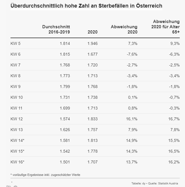 Stimmt, aber ich denke auch, dass sich die Zahl über einen längeren Zeitraum (1-2Jahre) wieder etwas relativiert, denn es sind Großteils Menschen gestorben die am Ende ihres Lebens waren.(alt, tlw. massive Vorerkrankungen) Ich will das jetzt nicht kleinreden, es ist schlimm, aber die jetzt Verstorbenen wären innerhalb absehbarer Zeit ohnehin gestorben. Jeder Todesfall ist tragisch, aber statistisch gesehen wird es sich in den nächsten beiden Jahren ausgleichen.