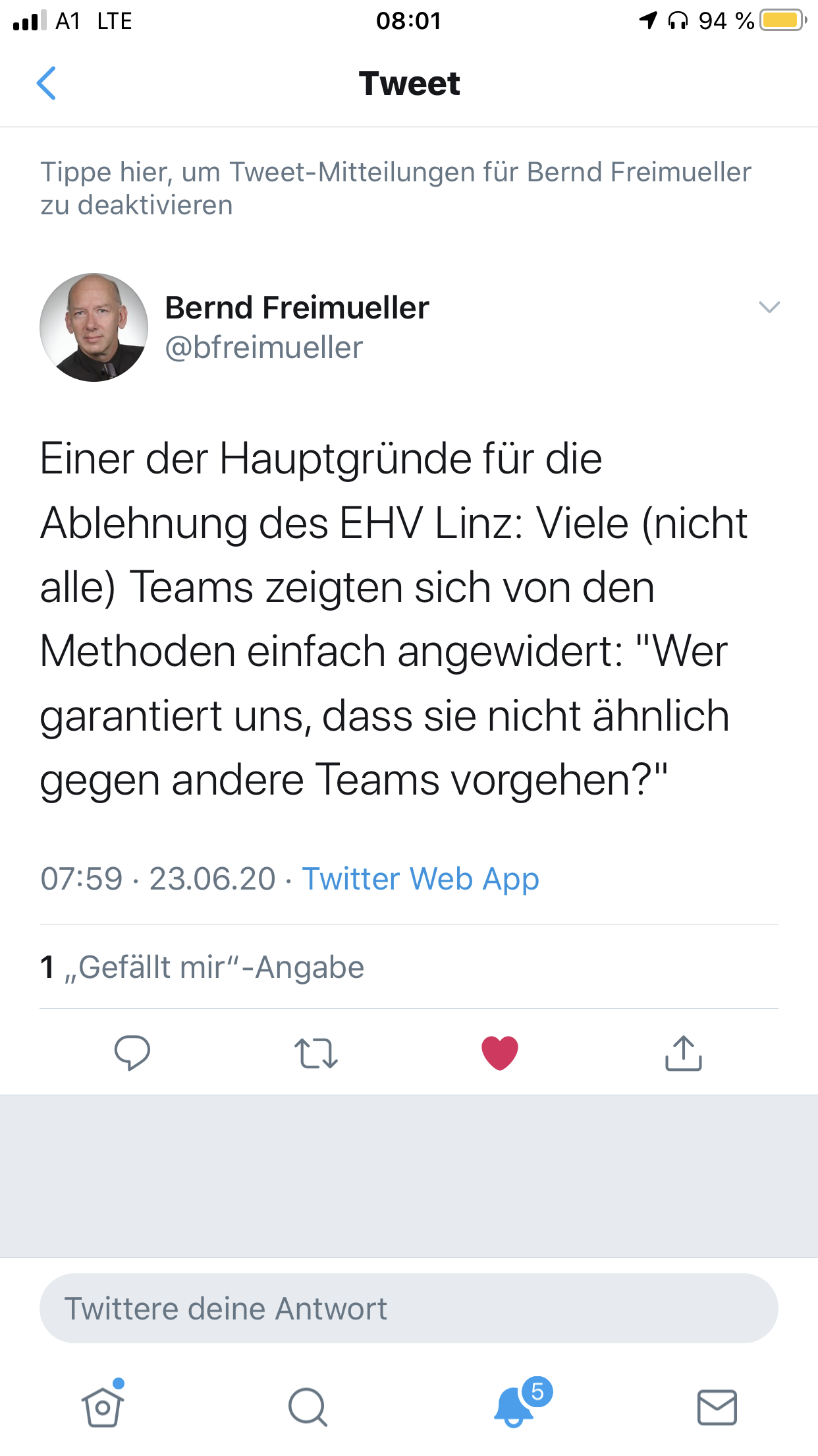 Kann mir auch nicht vorstellen dass, die von Freimüller erwähnte Begründung, einer DER hHuptgründe gewesen sein soll. Das liest sich ja so, dass die andere Vereine sich Sorgen machen, dass der EHV Linz gegen die anderen so Vorgehen könnte? Und vor was hätte man da Angst oder Sorgen? Das die Leute des EHV irgendetwas Wissen (oder zu Wissen glauben) über die Mitglieder der Liga und dagegen vorgehen (könnten)? Das wär ja doch a bissl dubios.