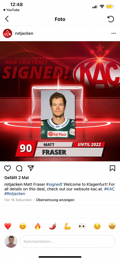 „Der EC-KAC verstärkt sich zur kommenden Saison 2021/22 mit Stürmer Matt Fraser, dem Champions Hockey League-Torschützenkönig der vergangenen Spielzeit. Der Kanadier wird allerdings bereits in der kommenden Woche in Klagenfurt erwartet und könnte auch schon in der aktuellen Saison für die #Rotjacken auflaufen.“