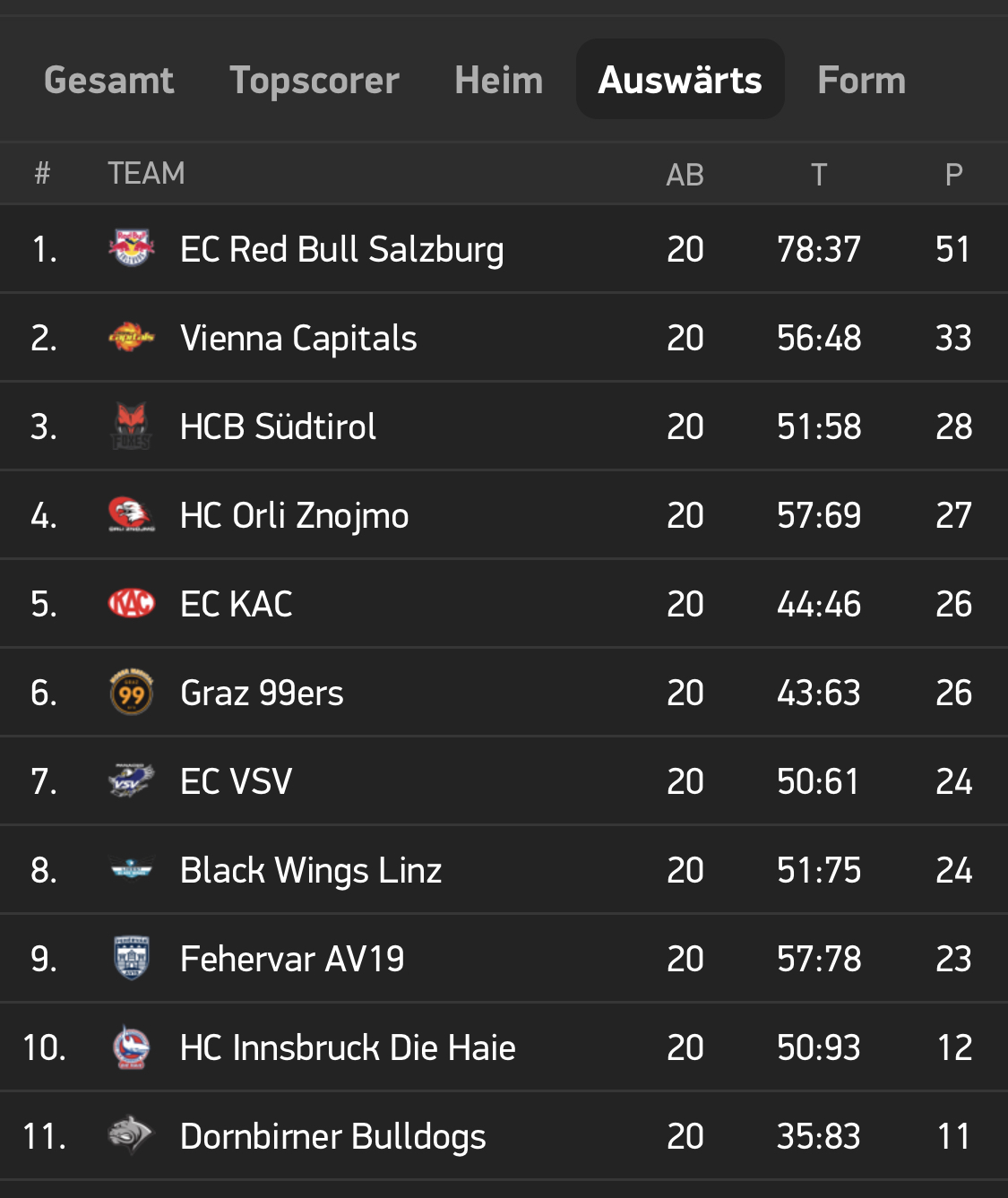 Ganz so eklatant war's heuer nicht - wenn ich mich nicht verzählt habe, stehen 13 Heimsiege im Grunddurchgang 9 Auswärtserfolgen (je zwei Mal in Dornbirn und Graz, je einmal in Wien, Salzburg, Linz, Innsbruck und Fehervar) gegenüber.