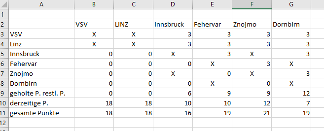Allerdings wären in dem Fall Linz und Villach mit 21 Punkten jedenfalls vor Znaim, dass dann auch nur noch maximal 21 Punkte erreichen könnte. Dornbirn wär jedenfalls draußen. Und da von Fehervar und Innsbruck, die ja noch gegeneinander spielen, nur einer 12 Punkte erreichen könnte, wären im Fall von Heimsiegen nach regulärer Spielzeit von Linz und VSV am Freitag tatsächlich beide weiter!