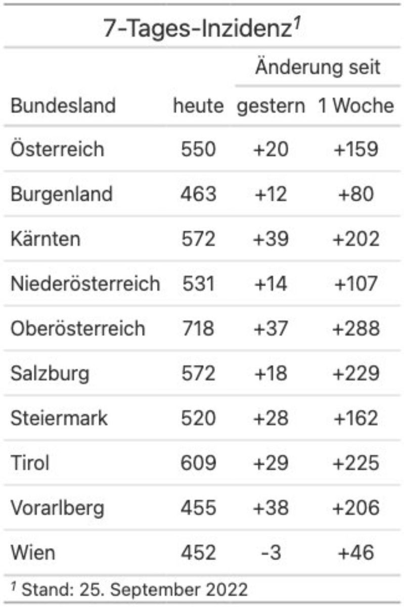 Sprich: Die Wiener sind vorsichtiger (mehr Tests, Maskenpflicht in Öffis) als die Äpplewoinköpfsche, die die "Dunkelziffer" an Infizierten hochhalten, was auch zu dem österreichweit höchsten Anstieg an 7-Tages-Inzidenz geführt hat, und zwar plus 288 (Wien plus 46).