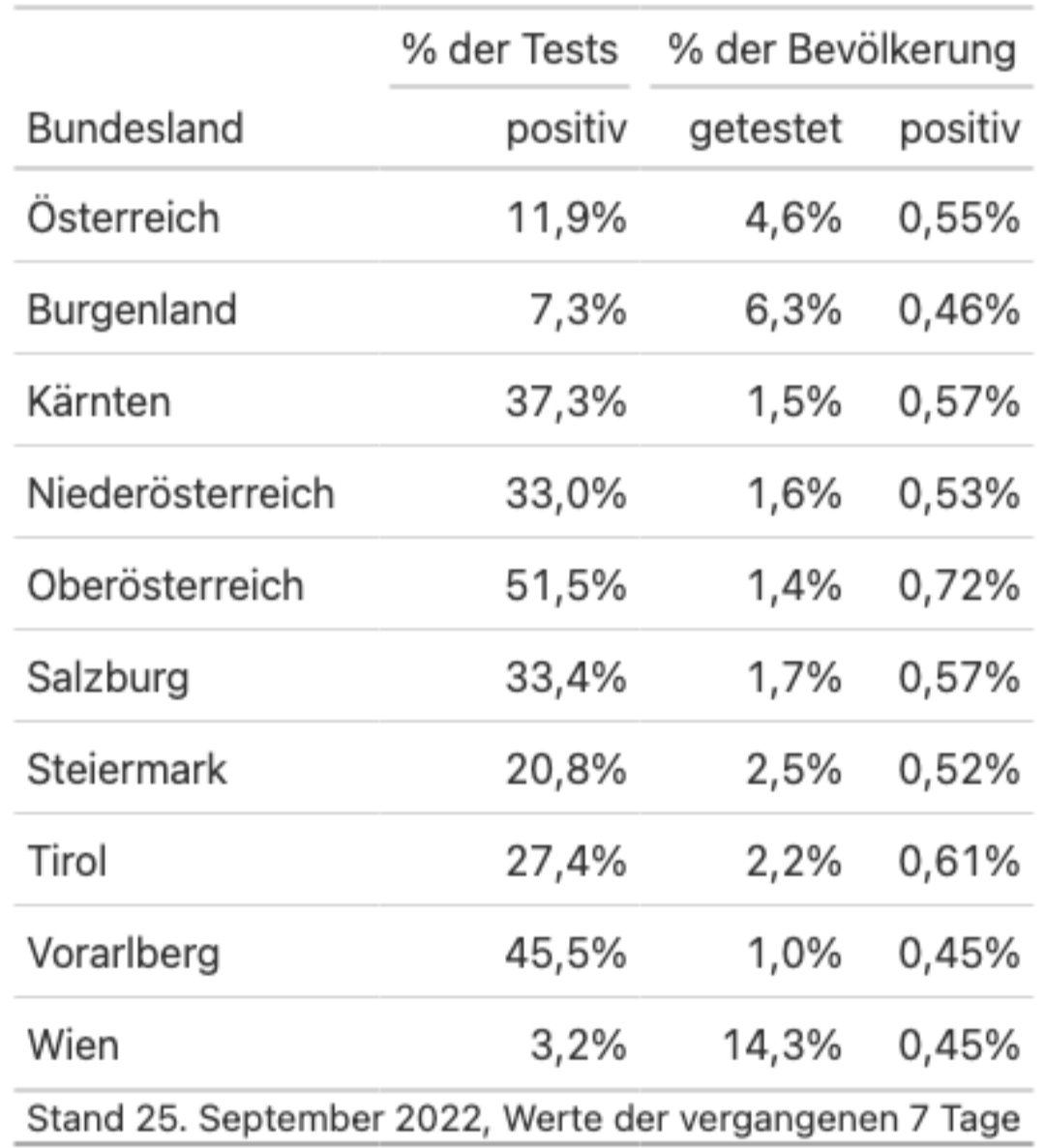 Schon sehr interessant die je nach Bundesland unterschiedlichen Positivitätsraten (Anteil der Positivbefunde pro durchgeführten Tests):