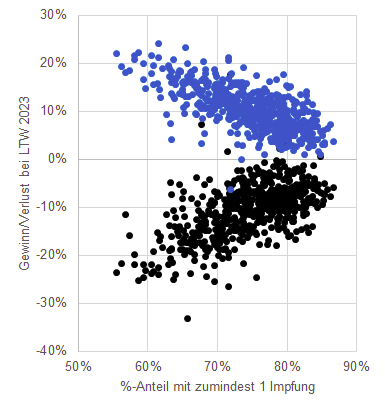 Je niedriger die Impfrate (wenigstens 1 Impfung) in der Gemeinde, desto höher die Zugewinne der FPÖ/Verluste der ÖVP.